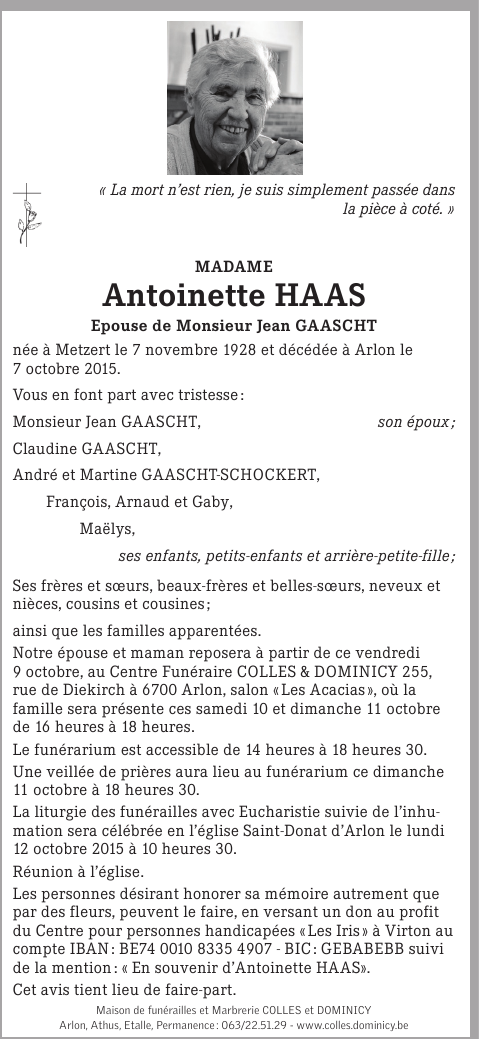 Décédée à Arlon (6700) le mercredi 7 octobre 2015 à l'âge de 86 ans