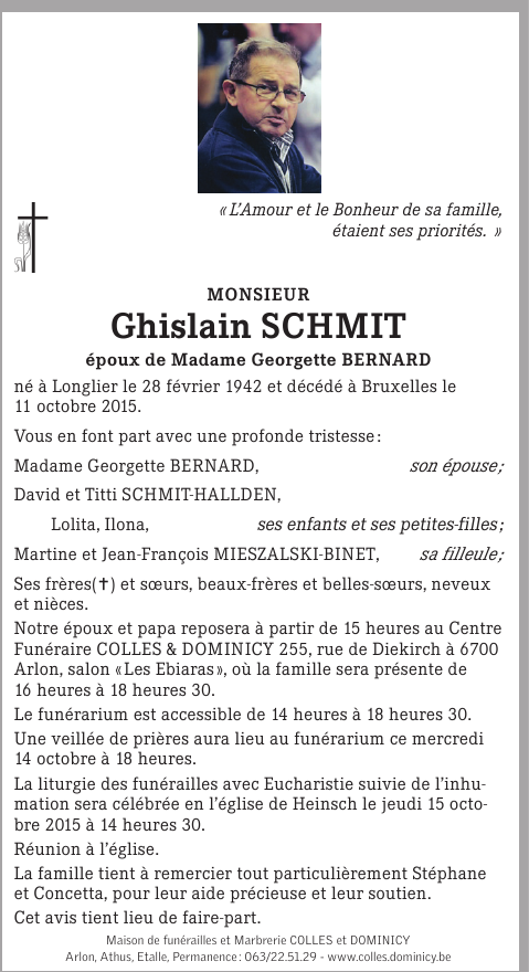 Décédé à Bruxelles (Woluwe-Saint-Lambert) (1200) le dimanche 11 octobre 2015 à l'âge de 73 ans