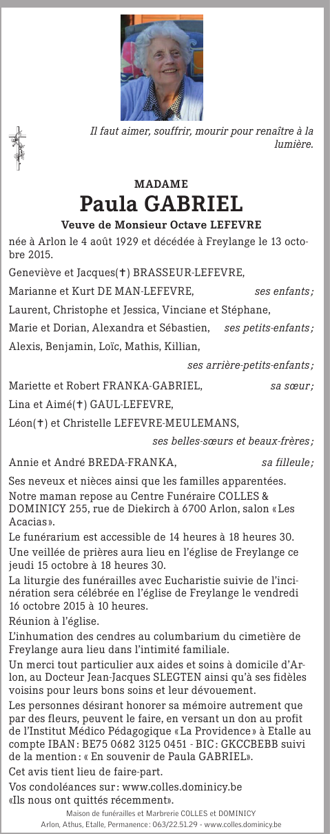 Décédée à Freylange (6700) le mardi 13 octobre 2015 à l'âge de 86 ans