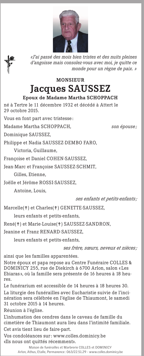 Décédé à Attert (6717) le jeudi 29 octobre 2015 à l'âge de 82 ans