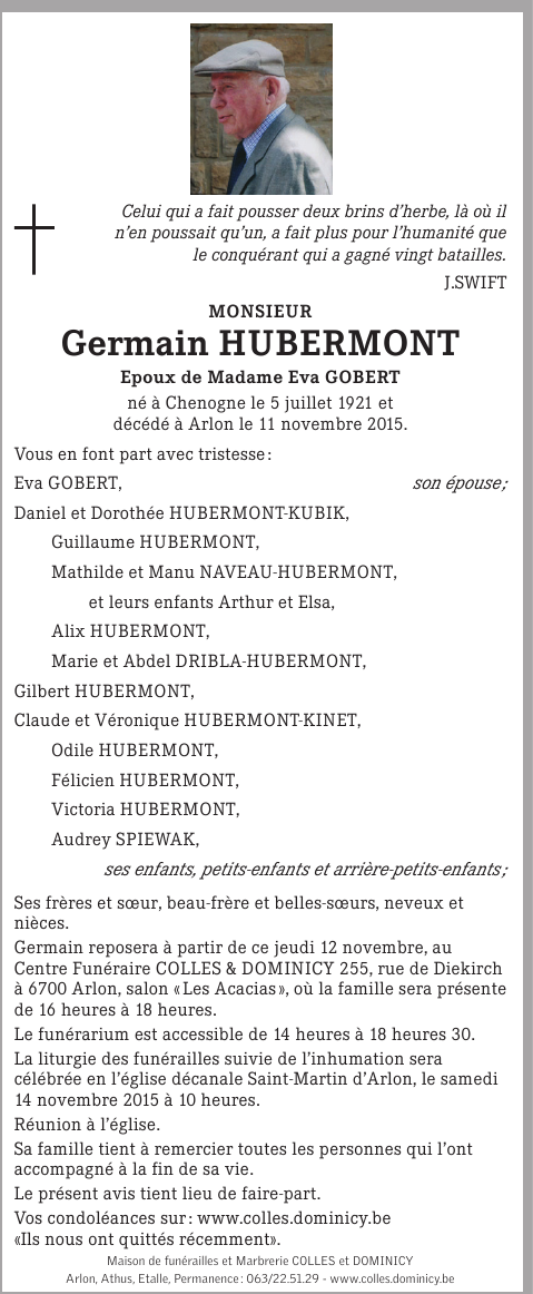 Décédé à Arlon (6700) le mercredi 11 novembre 2015 à l'âge de 94 ans