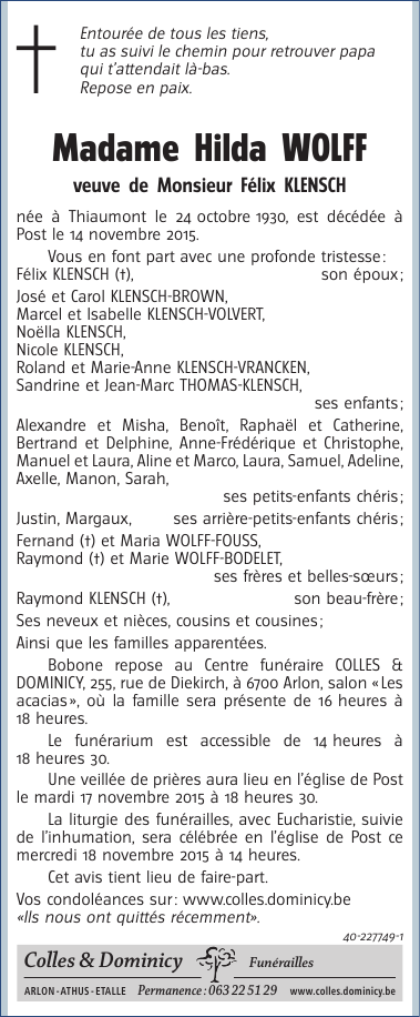 Décédée à Attert (6717) le samedi 14 novembre 2015 à l'âge de 85 ans