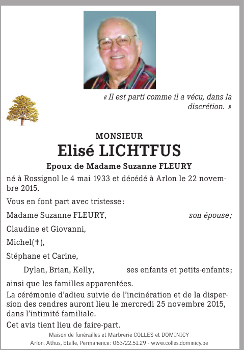 Décédé à Arlon (6700) le dimanche 22 novembre 2015 à l'âge de 82 ans