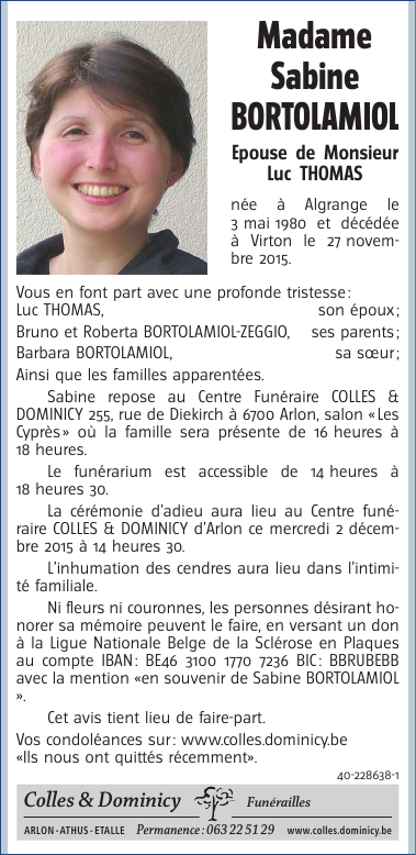 Décédée à Virton (6760) le vendredi 27 novembre 2015 à l'âge de 35 ans