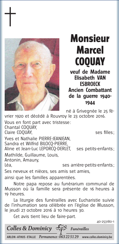Décédé à Rouvroy (6767) le dimanche 23 octobre 2016 à l'âge de 96 ans