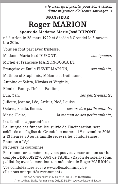 Décédé à Grendel (6717) le samedi 5 novembre 2016 à l'âge de 87 ans