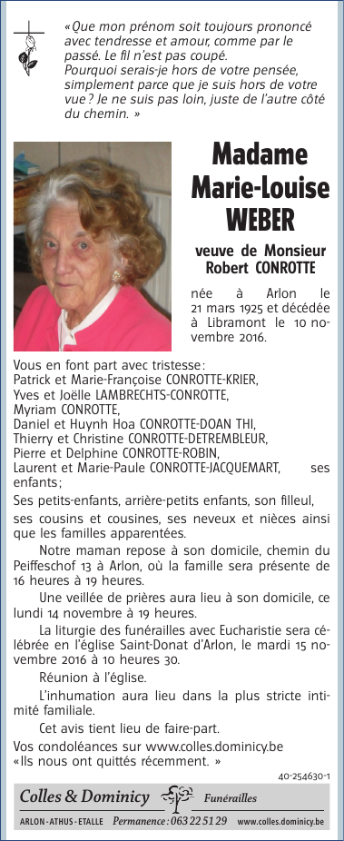 Décédée à Libramont (6800) le jeudi 10 novembre 2016 à l'âge de 91 ans