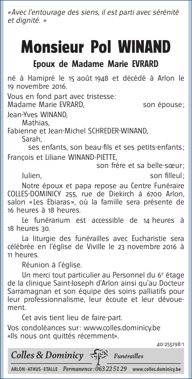 Décédé à Arlon (6700) le samedi 19 novembre 2016 à l'âge de 68 ans