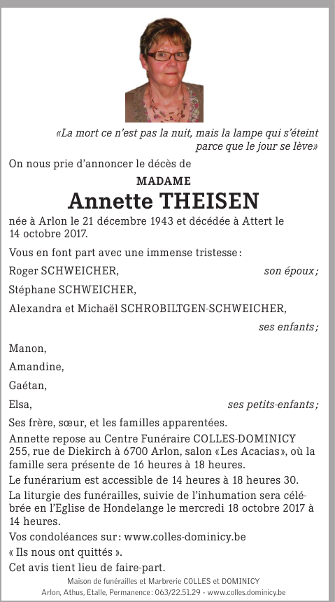 Décédée à Attert (6717) le samedi 14 octobre 2017 à l'âge de 73 ans