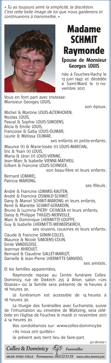 Décédée à Saint-Mard (6762) le vendredi 17 novembre 2017 à l'âge de 74 ans