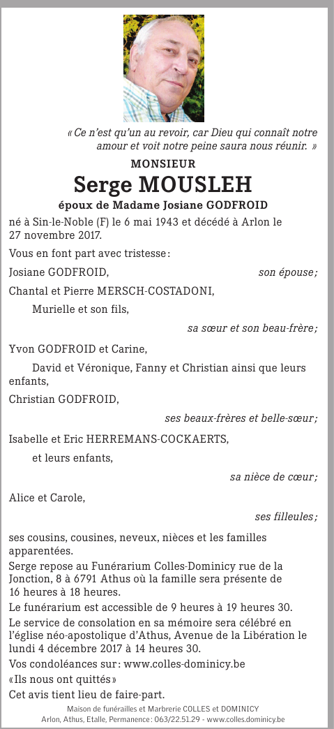 Décédé à Arlon (6700) le lundi 27 novembre 2017 à l'âge de 74 ans