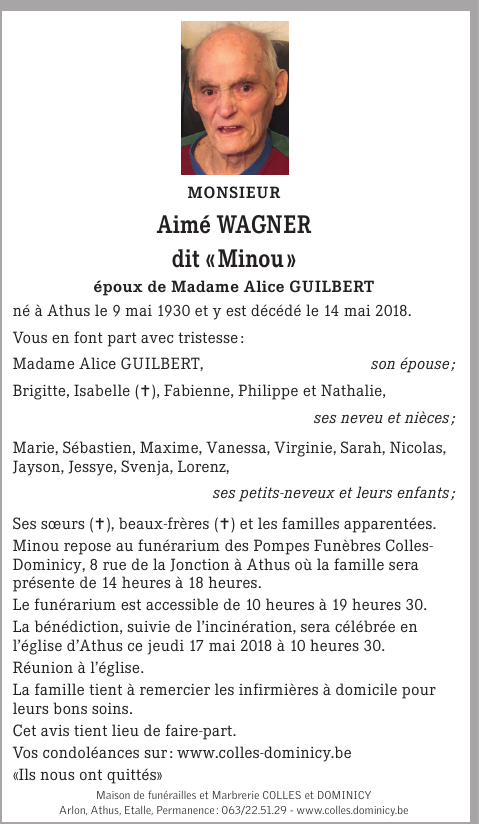 Décédé à Athus (6791) le lundi 14 mai 2018 à l'âge de 88 ans