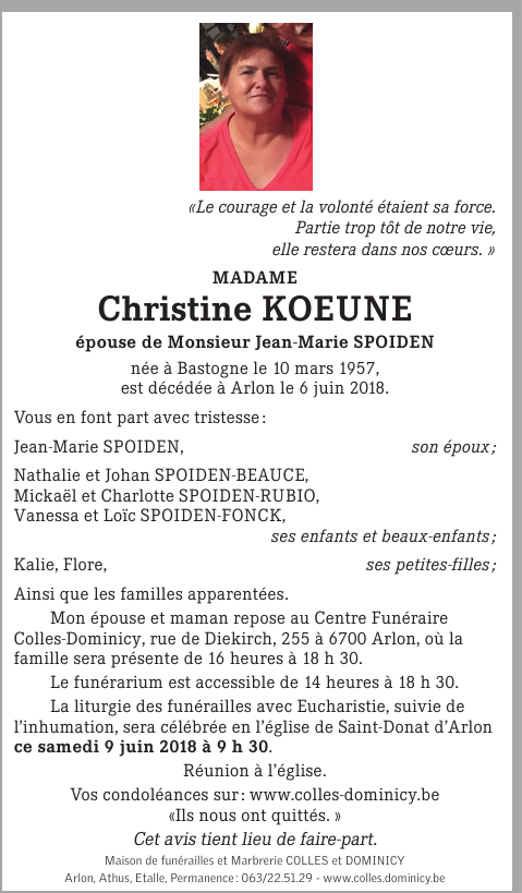 Décédée à Arlon (6700) le mercredi 6 juin 2018 à l'âge de 61 ans