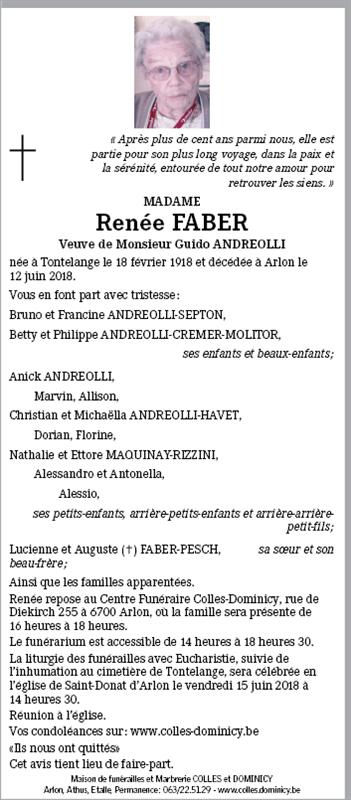 Décédée à Arlon (6700) le mardi 12 juin 2018 à l'âge de 100 ans
