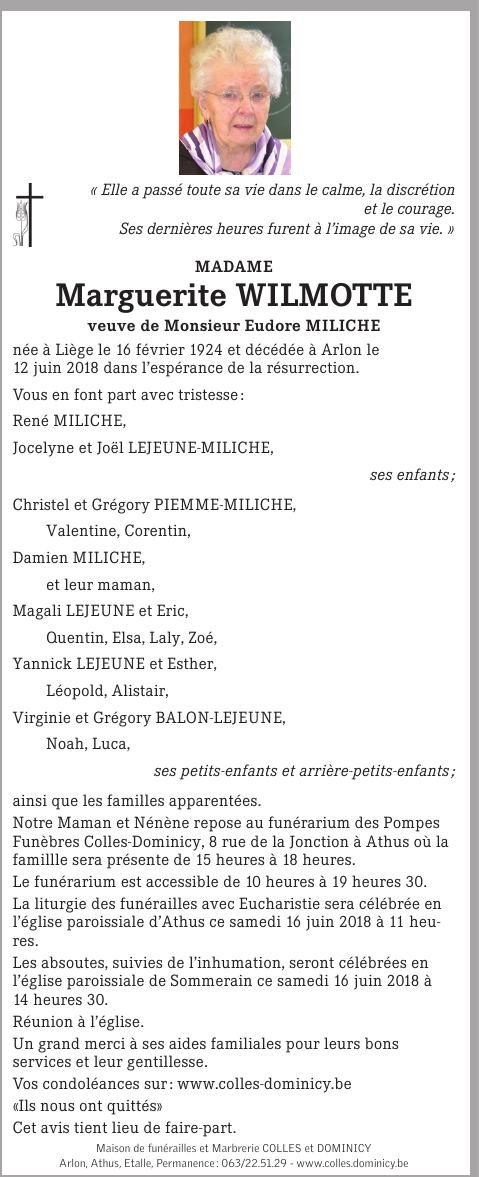 Décédée à Arlon (6700) le mardi 12 juin 2018 à l'âge de 94 ans