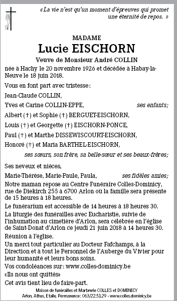 Décédée à Habay-la-Neuve (6720) le lundi 18 juin 2018 à l'âge de 91 ans