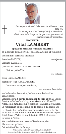 Décédé à Arlon (6700) le jeudi 21 juin 2018 à l'âge de 68 ans