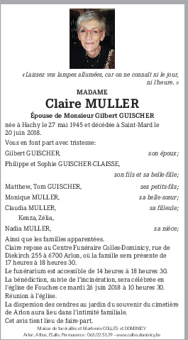 Décédée à Arlon (6700) le mercredi 20 juin 2018 à l'âge de 73 ans