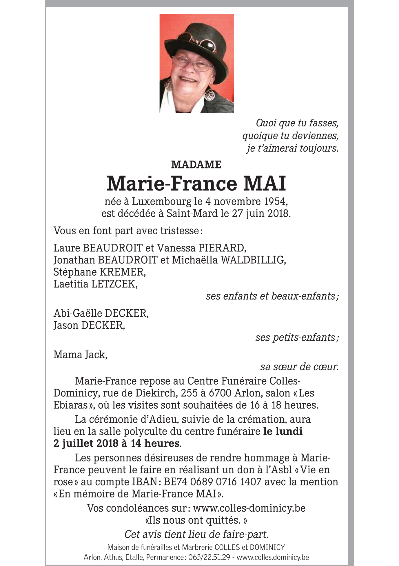 Décédée à Saint-Mard (6762) le mercredi 27 juin 2018 à l'âge de 63 ans