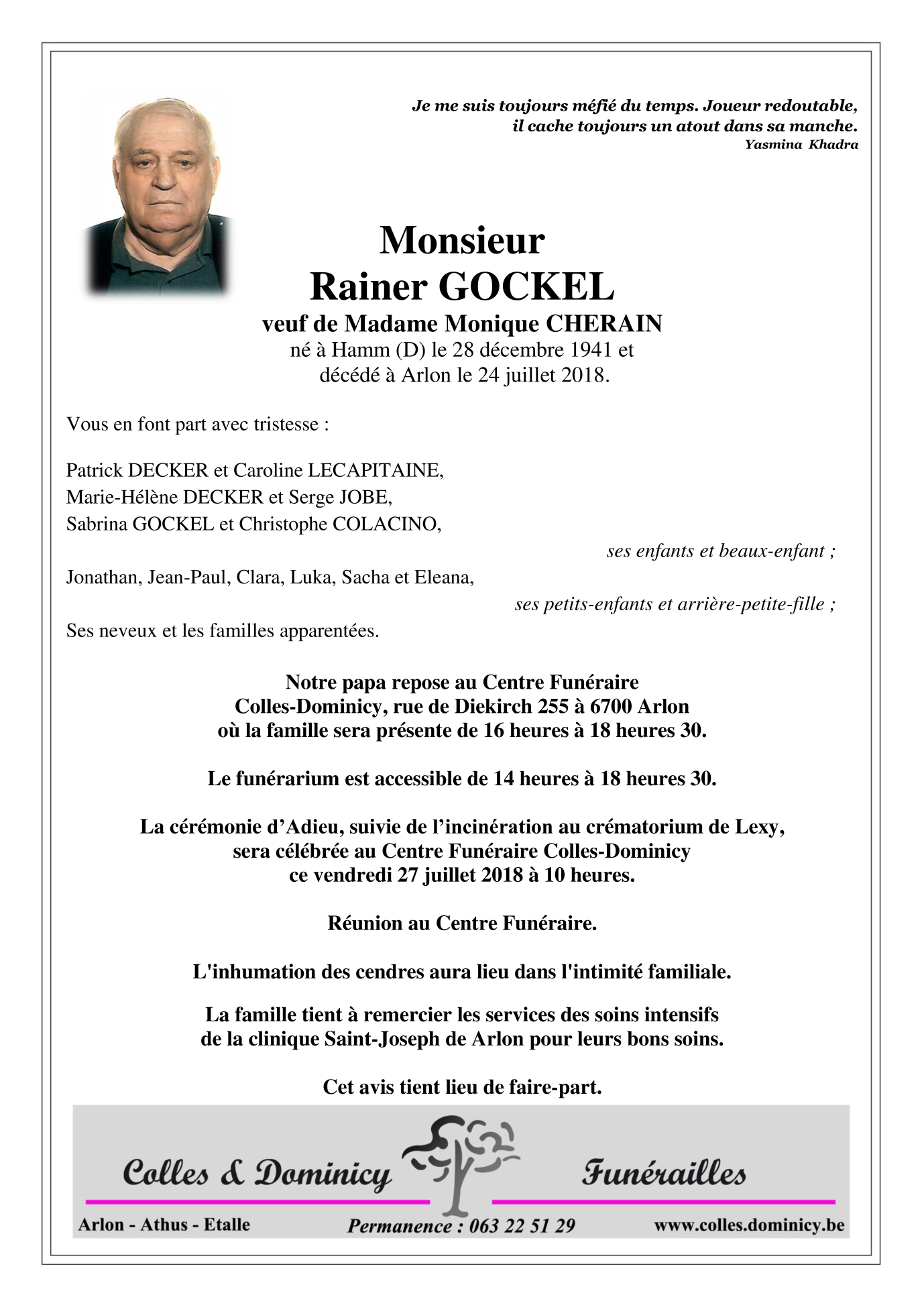 Décédé à Arlon (6700) le mardi 24 juillet 2018 à l'âge de 76 ans