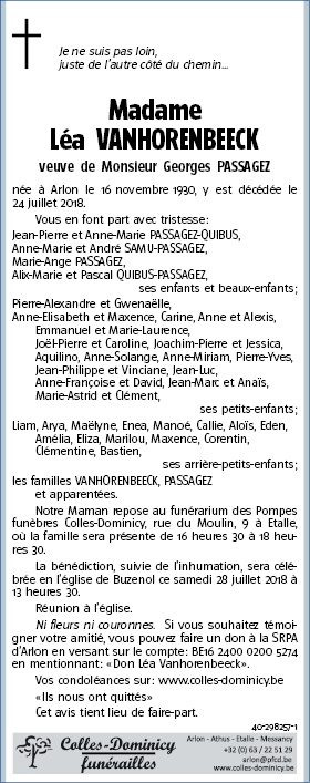 Décédée à Arlon (6700) le mardi 24 juillet 2018 à l'âge de 87 ans