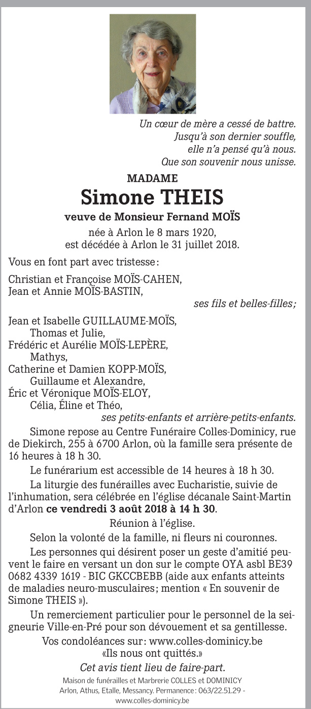 Décédée à Arlon (6700) le mardi 31 juillet 2018 à l'âge de 98 ans
