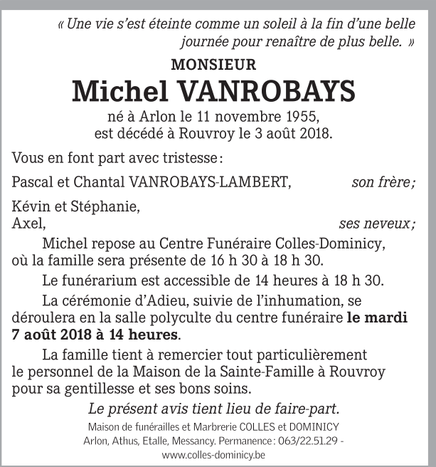 Décédé à Rouvroy (6767) le vendredi 3 août 2018 à l'âge de 62 ans