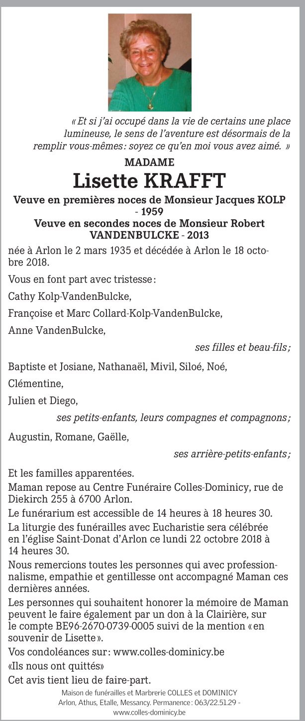 Décédée à Arlon (6700) le jeudi 18 octobre 2018 à l'âge de 83 ans