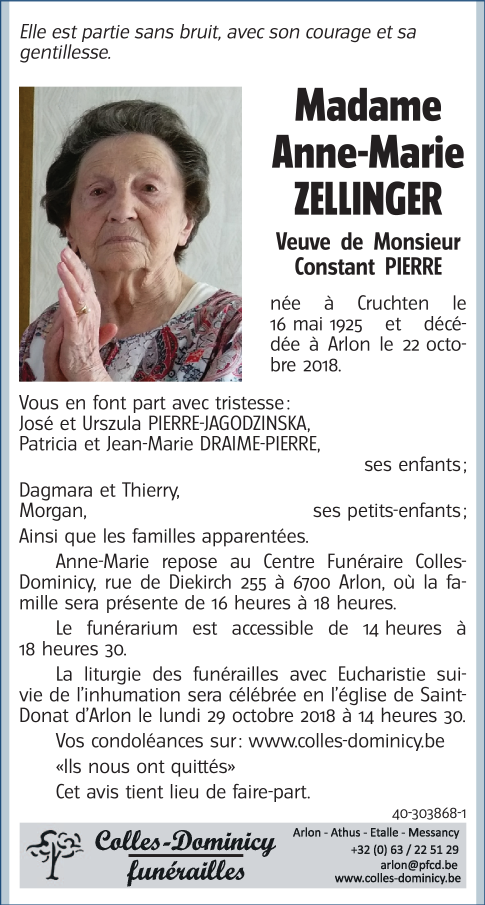 Décédée à Arlon (6700) le lundi 22 octobre 2018 à l'âge de 93 ans