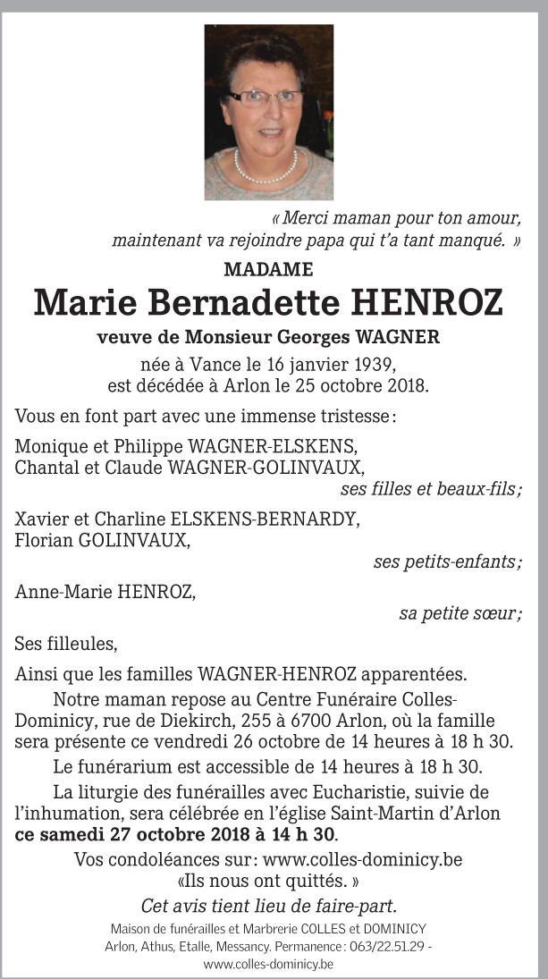 Décédée à Arlon (6700) le jeudi 25 octobre 2018 à l'âge de 79 ans
