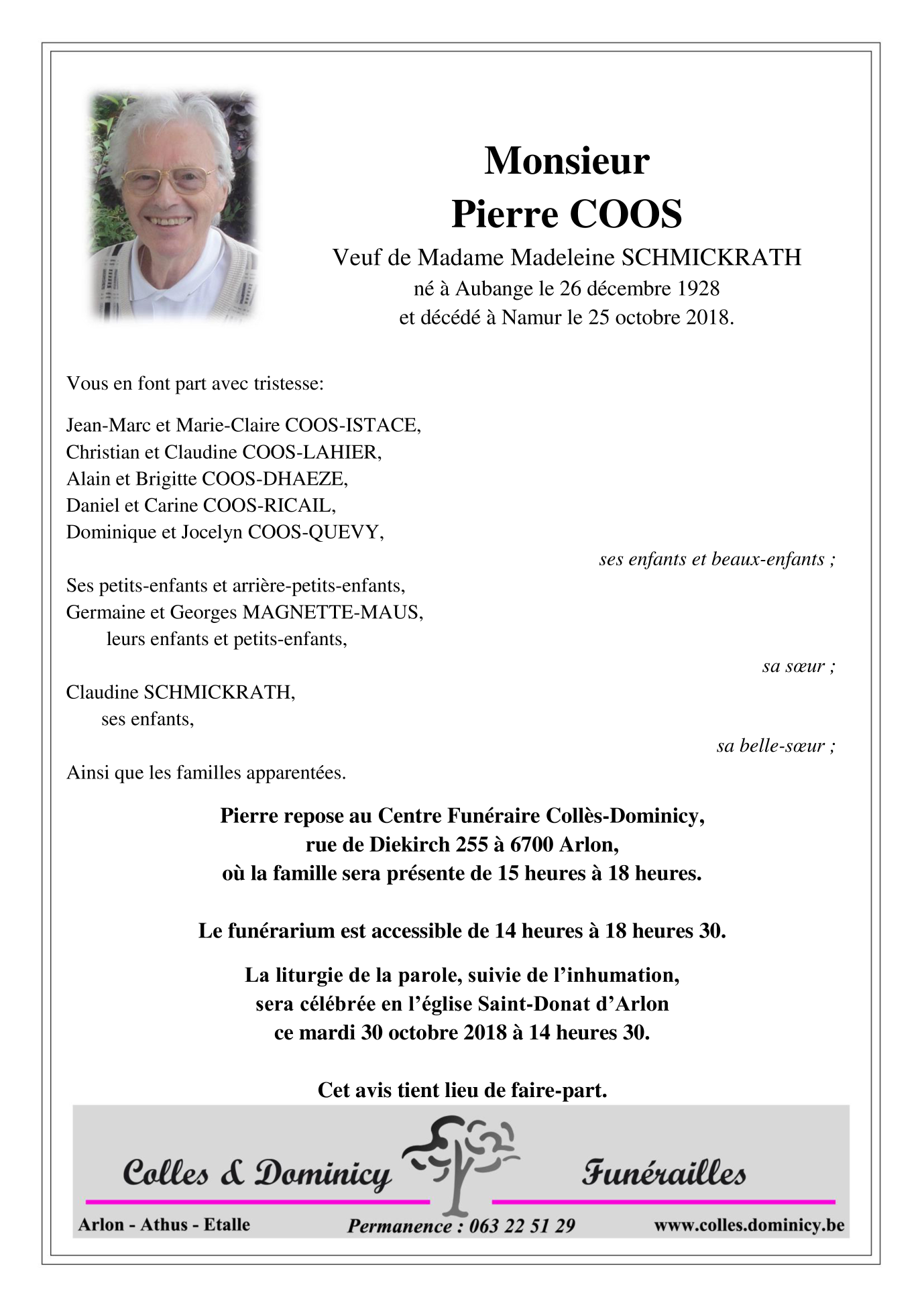 Décédé à Namur (5000) le jeudi 25 octobre 2018 à l'âge de 89 ans