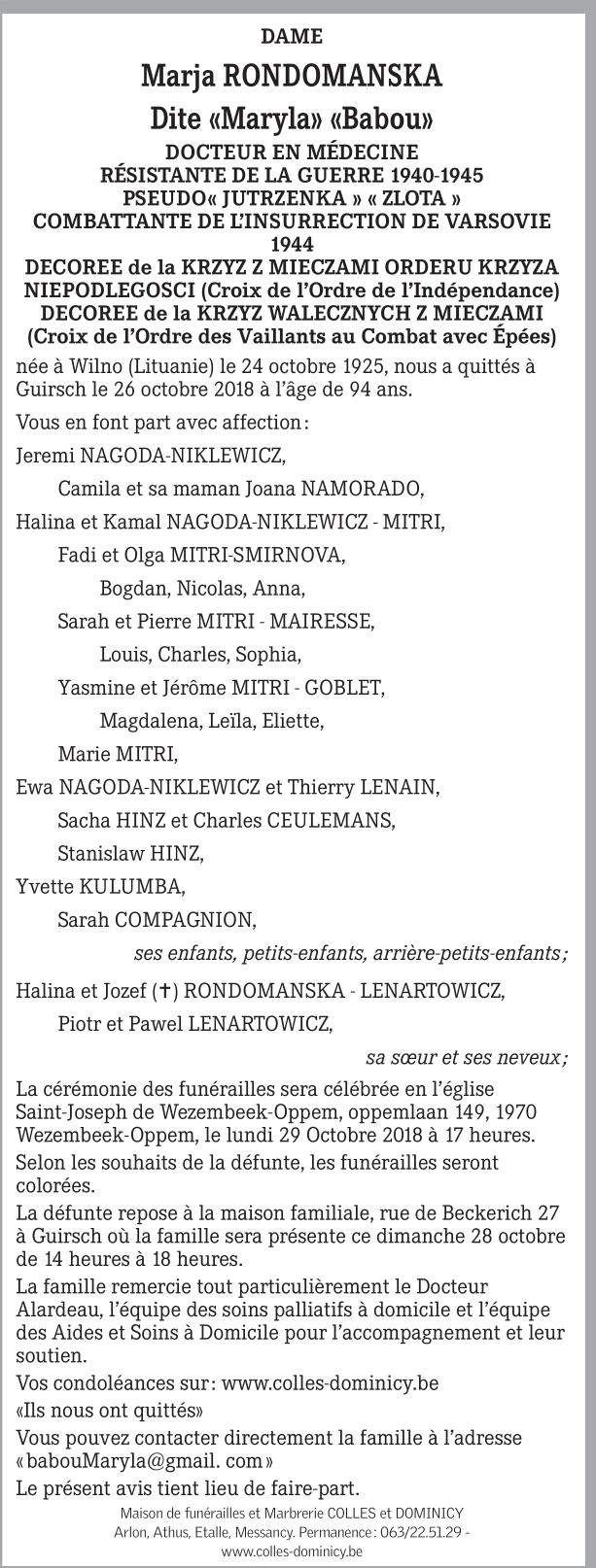 Décédée à Arlon (6700) le vendredi 26 octobre 2018 à l'âge de 93 ans