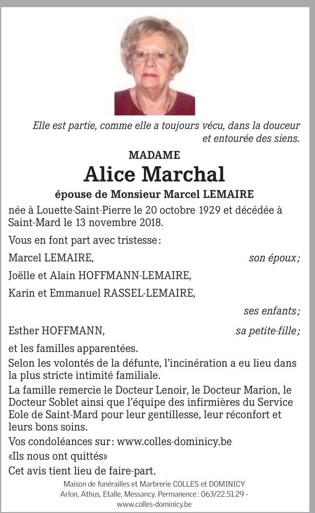 Décédée à Saint-Mard (6762) le mardi 13 novembre 2018 à l'âge de 89 ans