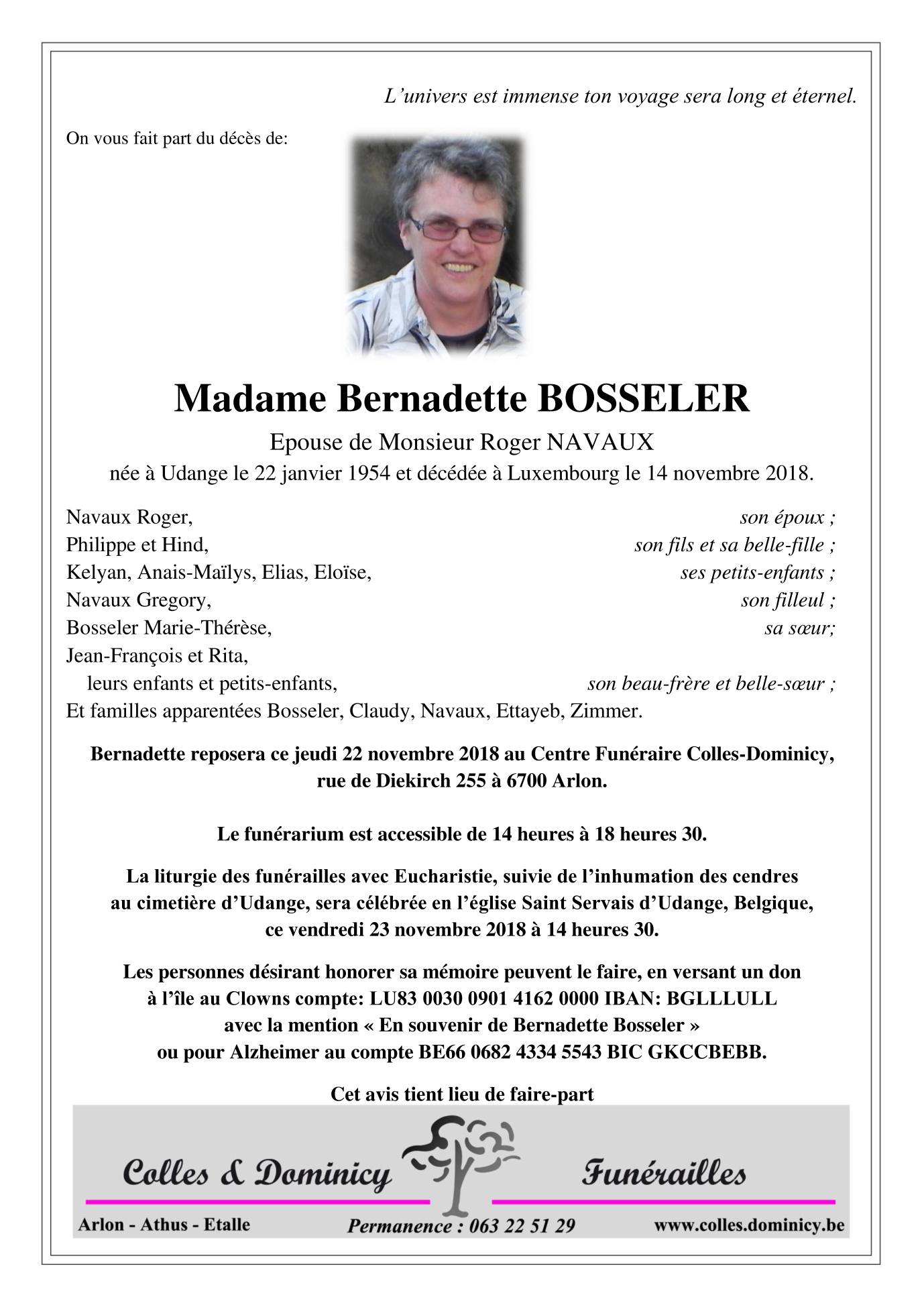 Décédée à Luxembourg/Luxembourg  (1616, Luxembourg) le mercredi 14 novembre 2018 à l'âge de 64 ans