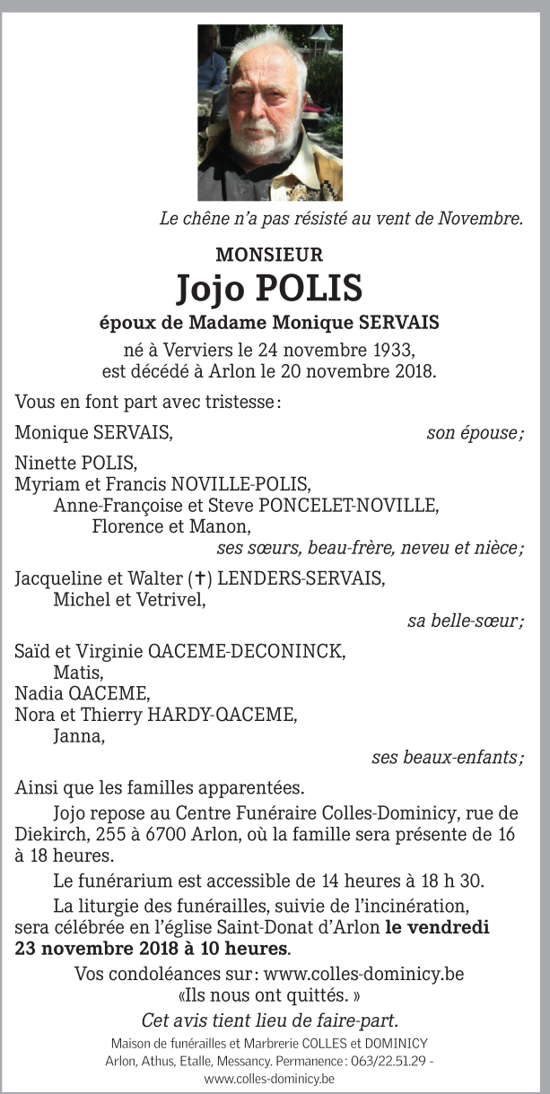 Décédé à Arlon (6700) le mardi 20 novembre 2018 à l'âge de 84 ans