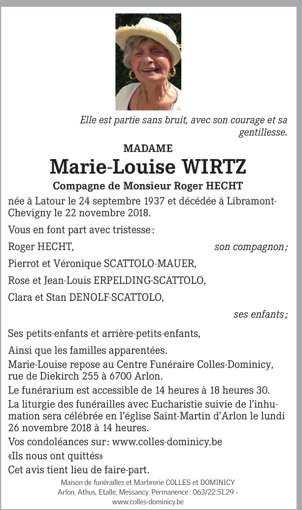 Décédée à Libramont (6800) le jeudi 22 novembre 2018 à l'âge de 81 ans