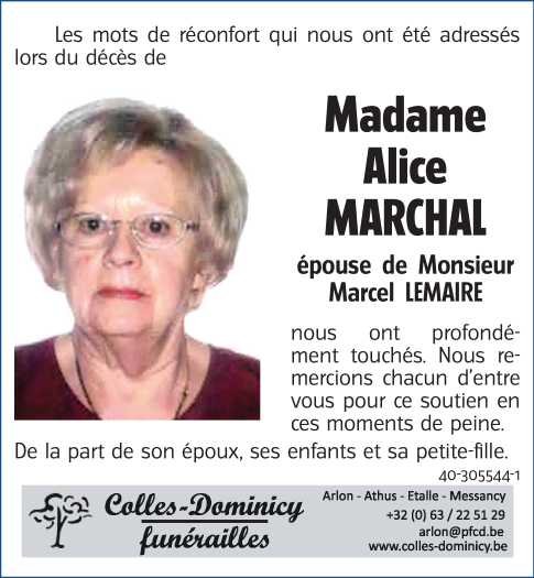 Décédée à Saint-Mard (6762) le mardi 13 novembre 2018 à l'âge de 89 ans