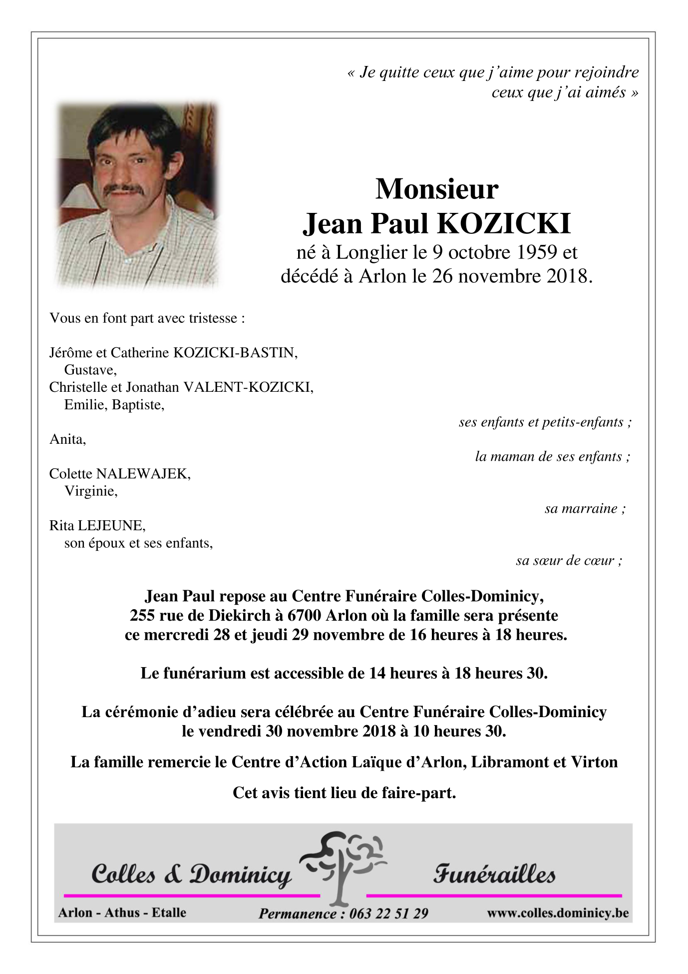 Décédé à Arlon (6700) le lundi 26 novembre 2018 à l'âge de 59 ans