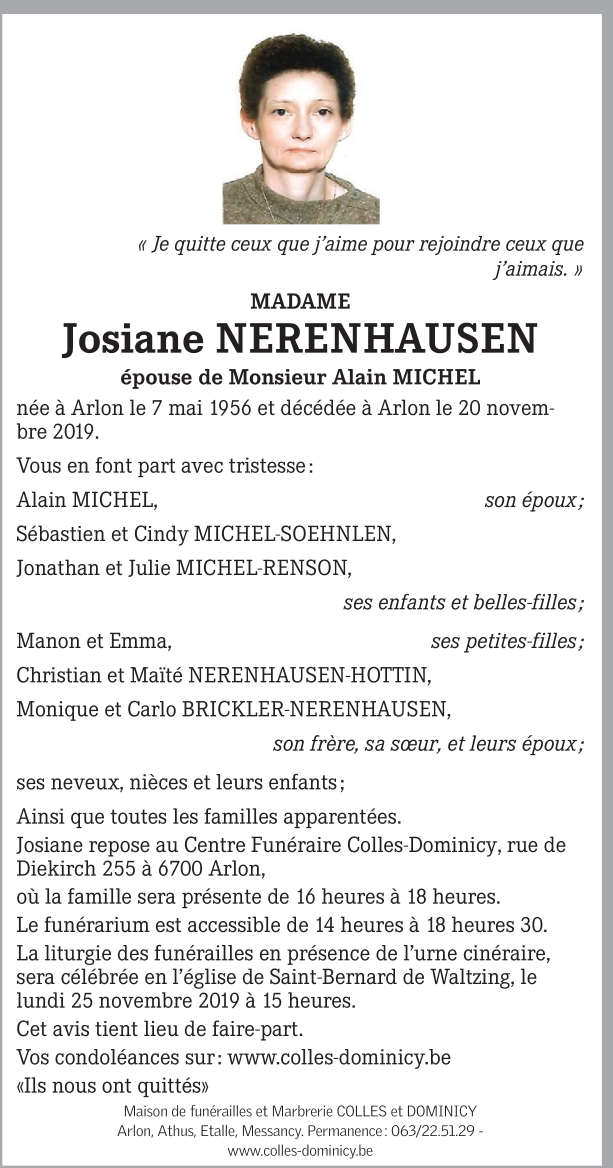 Décédée à Arlon (6700) le mercredi 20 novembre 2019 à l'âge de 63 ans
