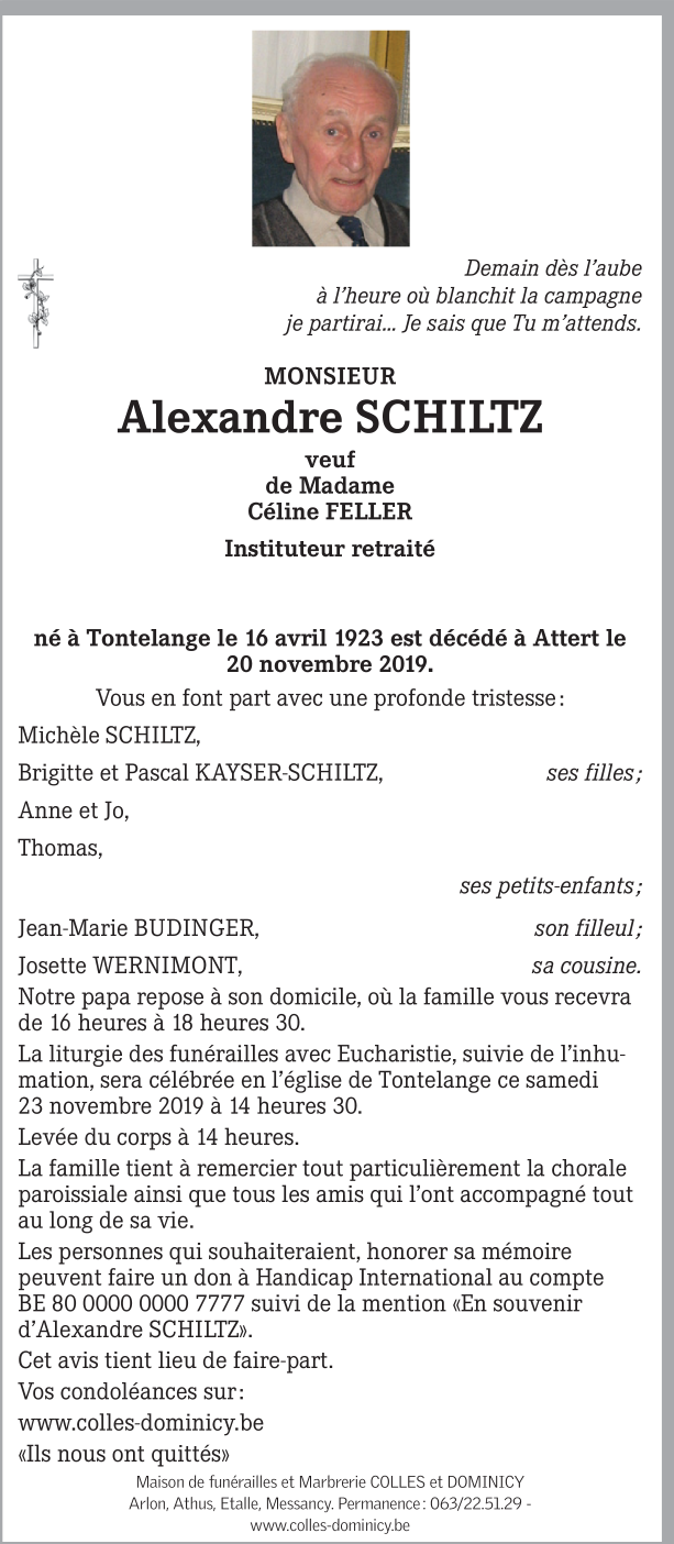 Décédé à Attert (6717) le mercredi 20 novembre 2019 à l'âge de 96 ans