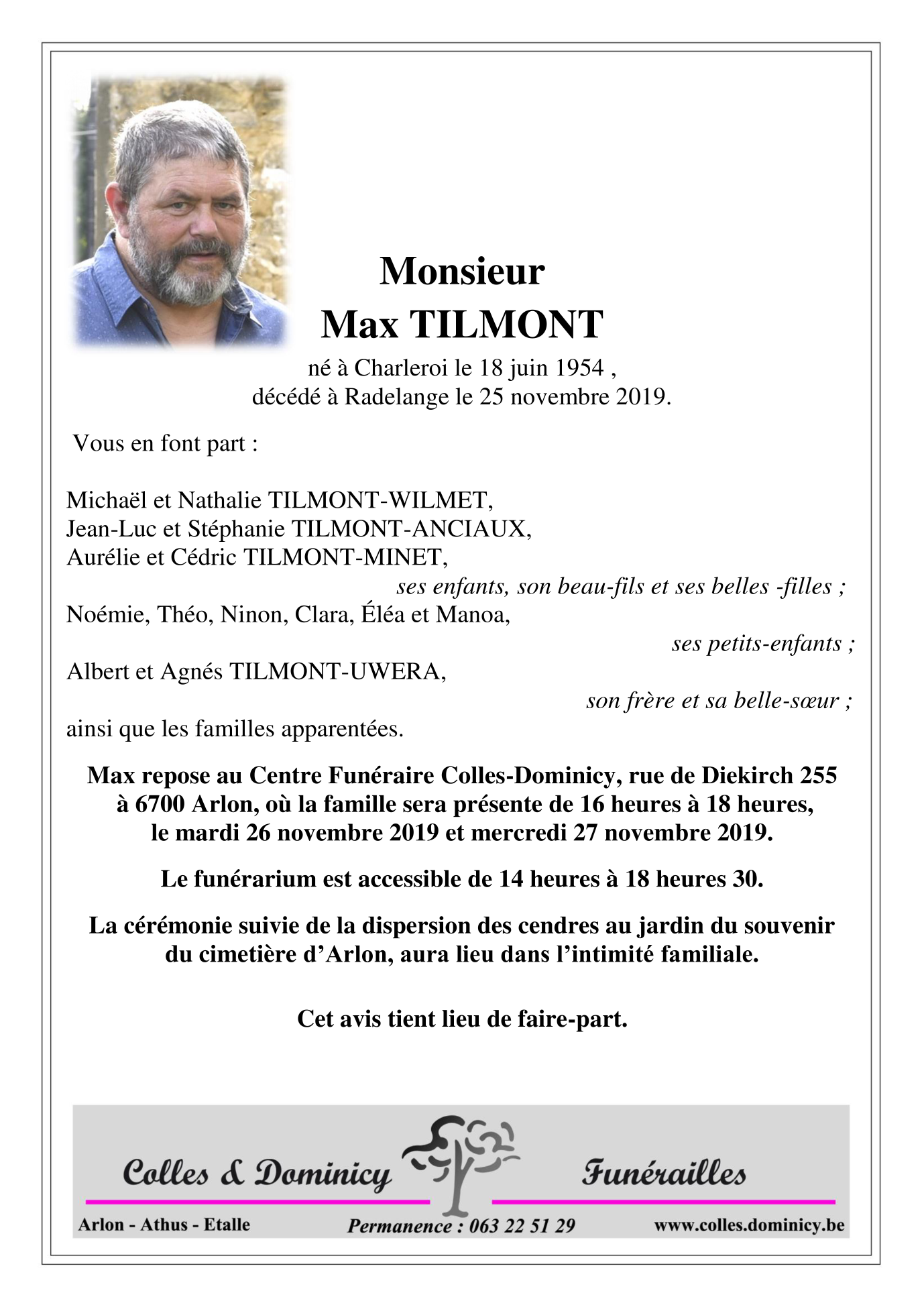 Décédé à Radelange (6630) le lundi 25 novembre 2019 à l'âge de 65 ans