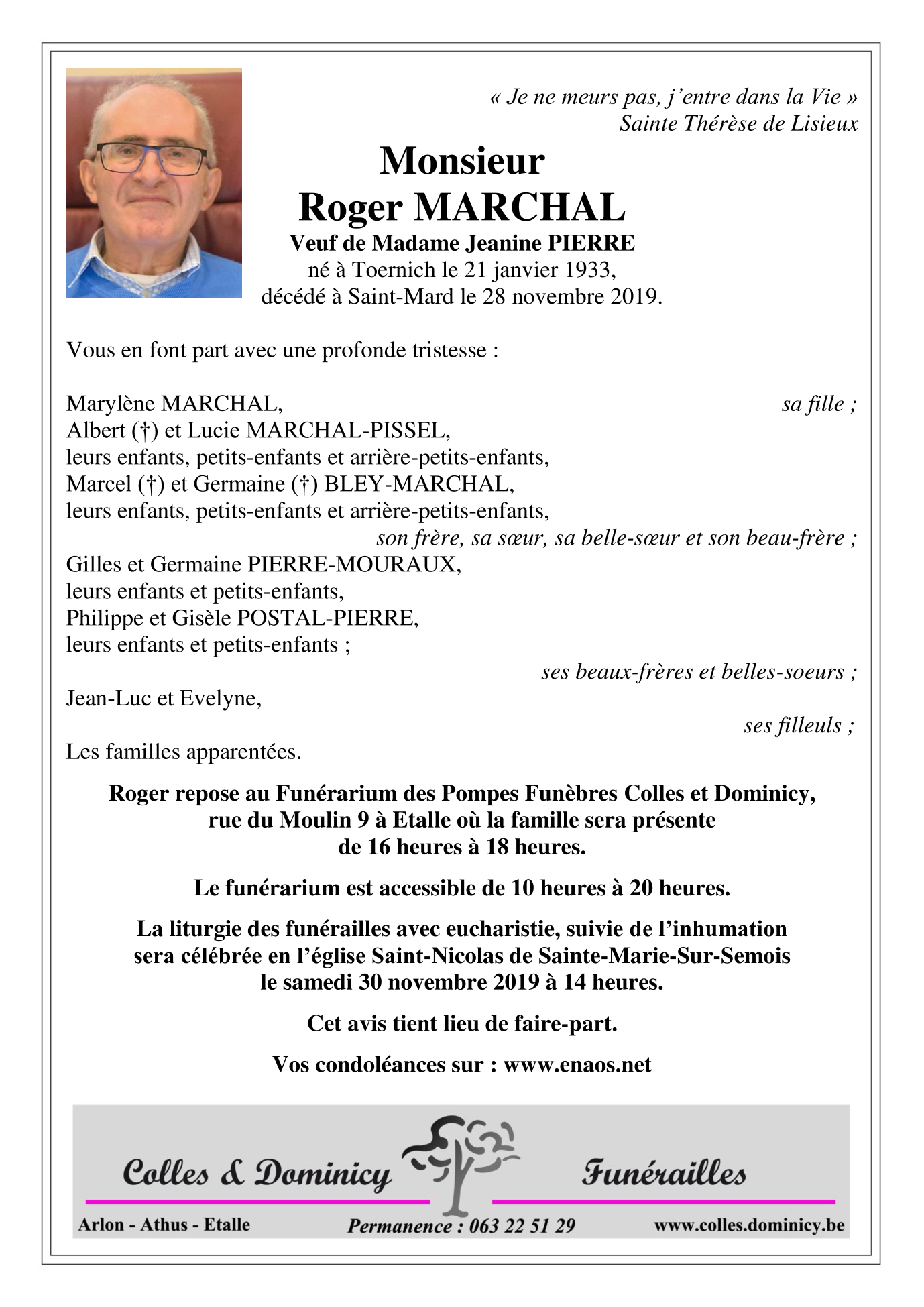 Décédé à Saint-Mard (6762) le jeudi 28 novembre 2019 à l'âge de 86 ans