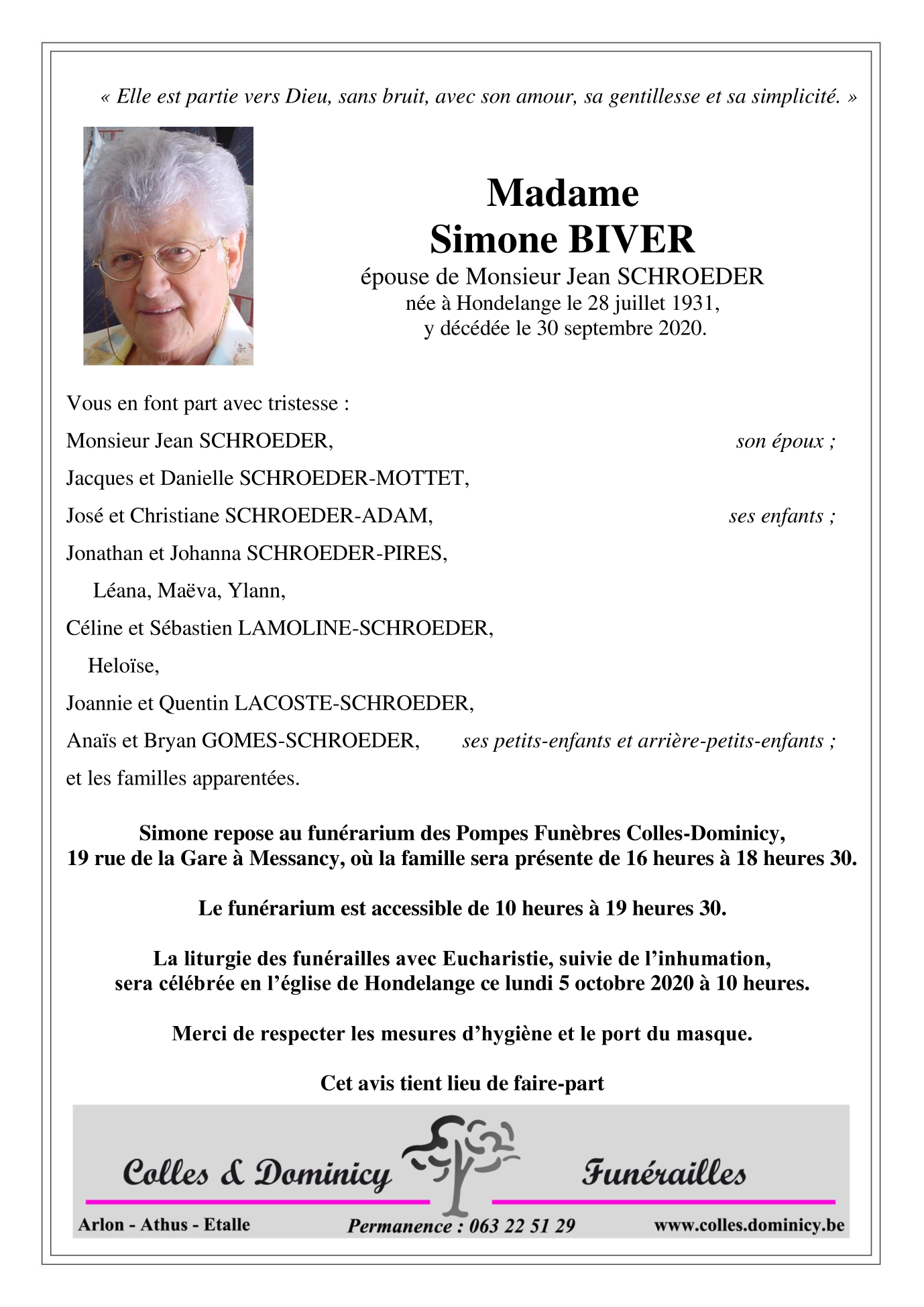Décédée à Hondelange (6780) le mercredi 30 septembre 2020 à l'âge de 89 ans