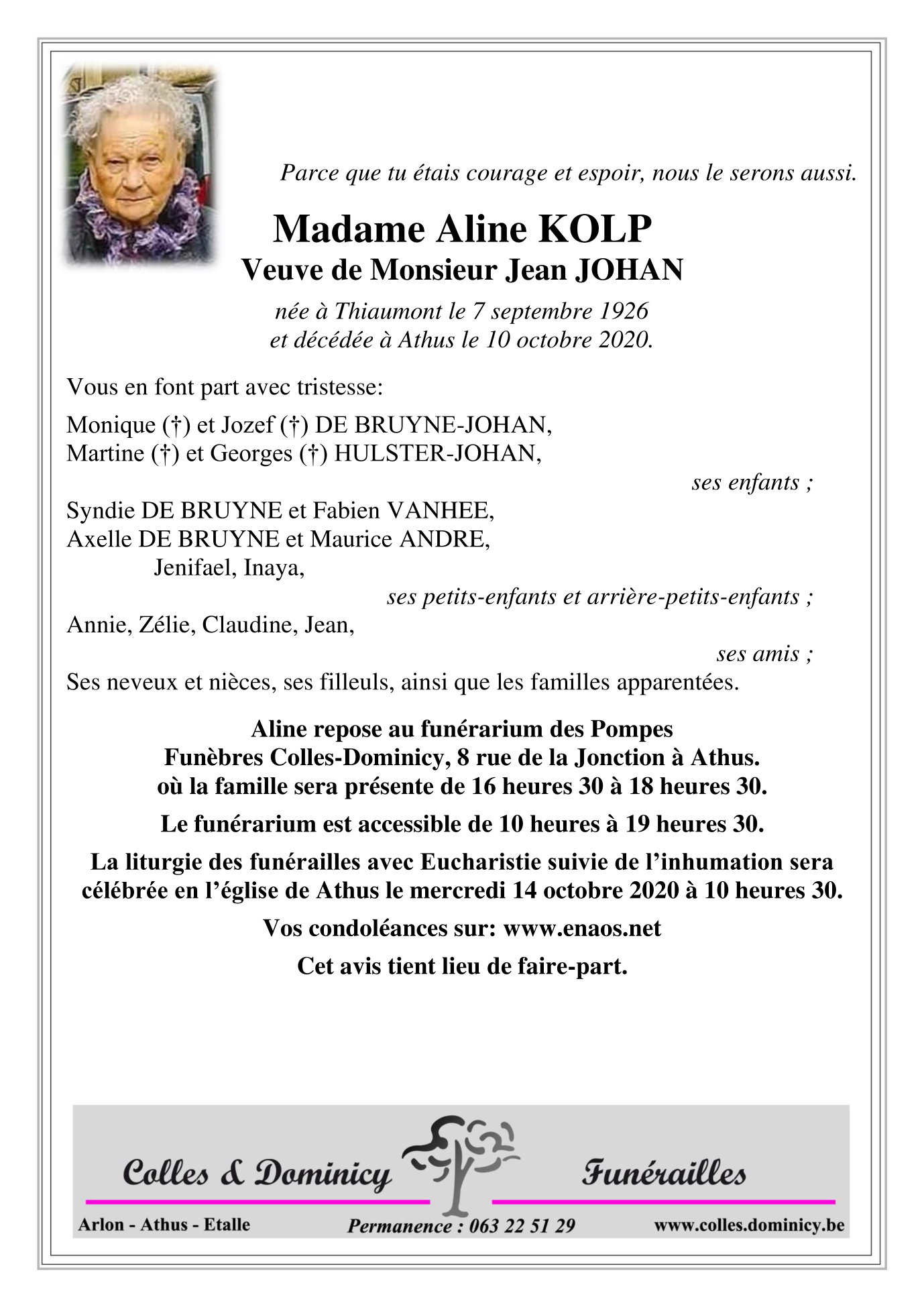 Décédée à Athus (6791) le samedi 10 octobre 2020 à l'âge de 94 ans