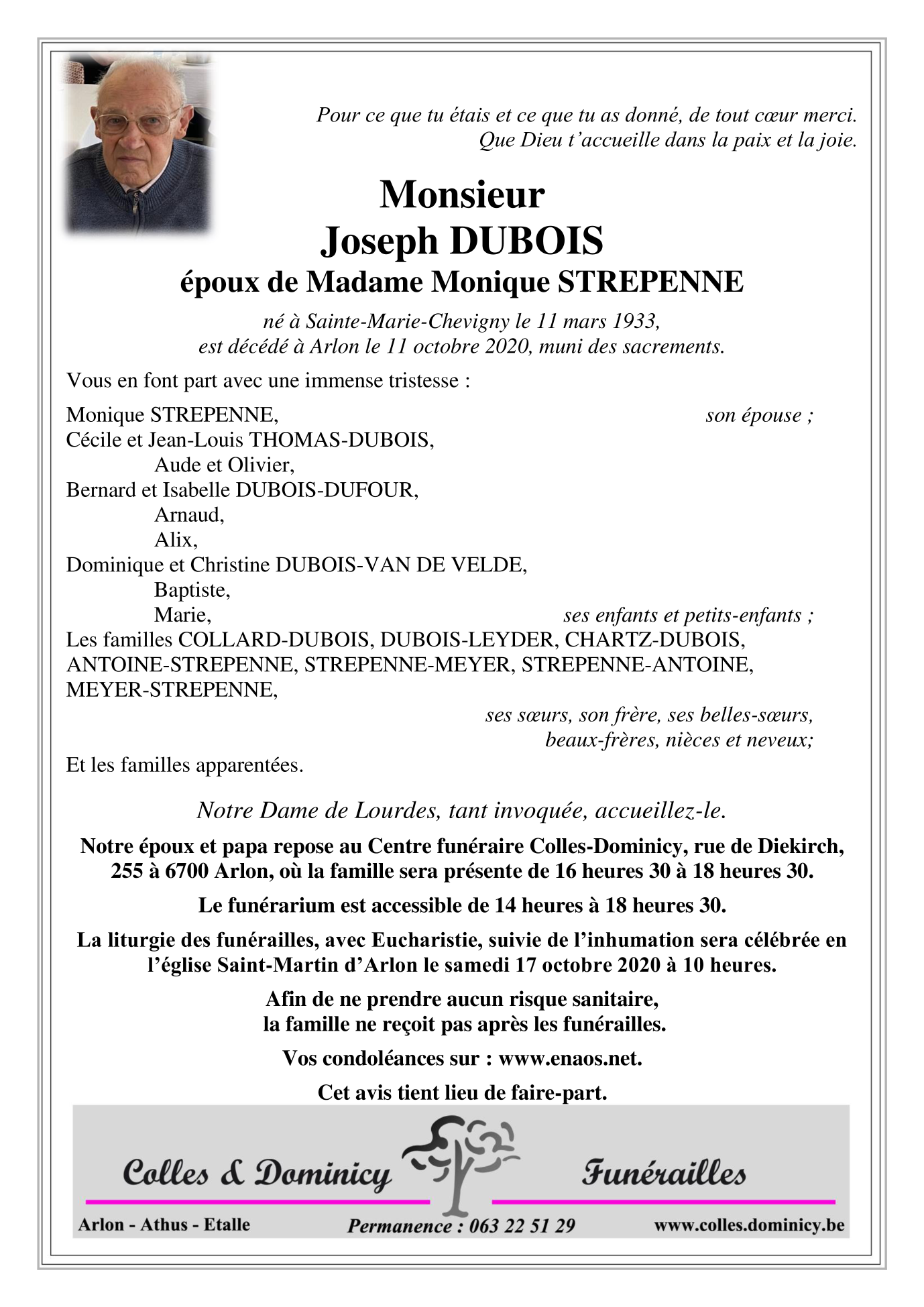 Décédé à Arlon (6700) le dimanche 11 octobre 2020 à l'âge de 87 ans