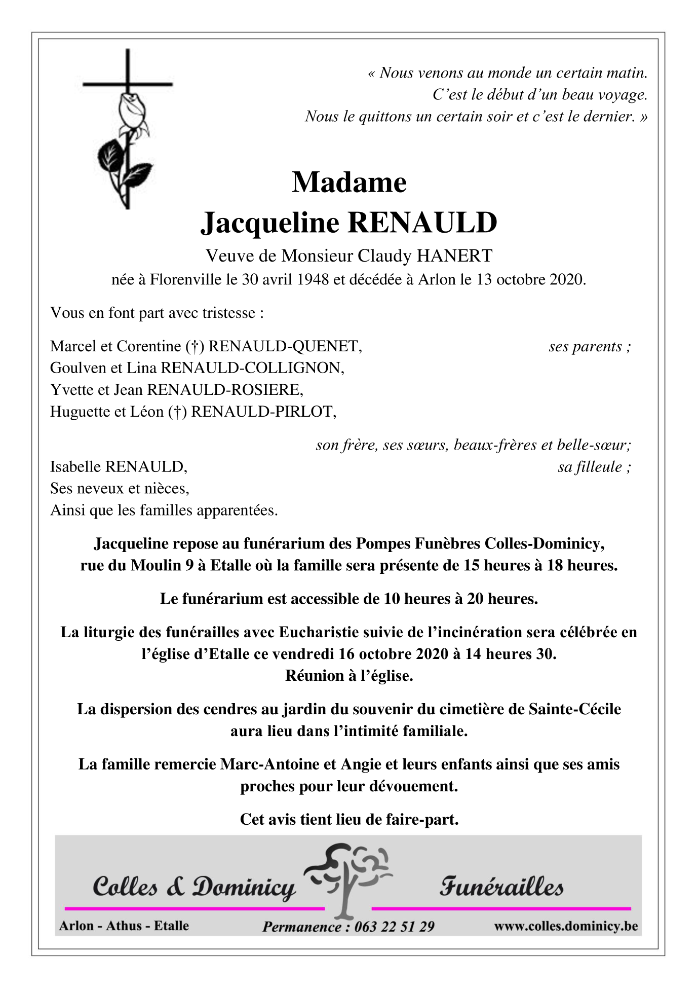 Décédée à Arlon (6700) le mardi 13 octobre 2020 à l'âge de 72 ans