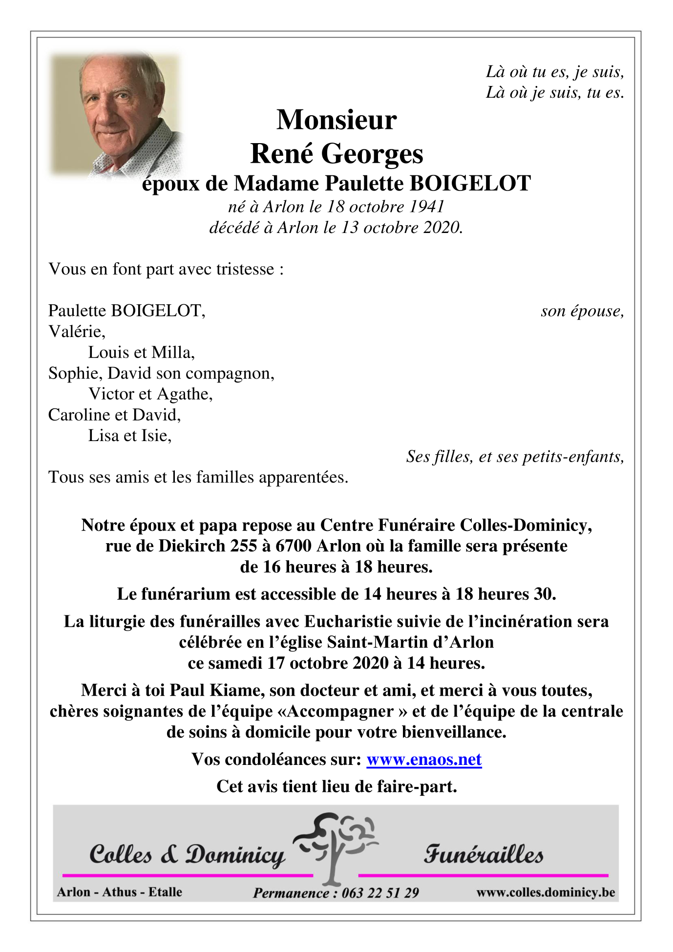 Décédé à Arlon (6700) le mardi 13 octobre 2020 à l'âge de 78 ans