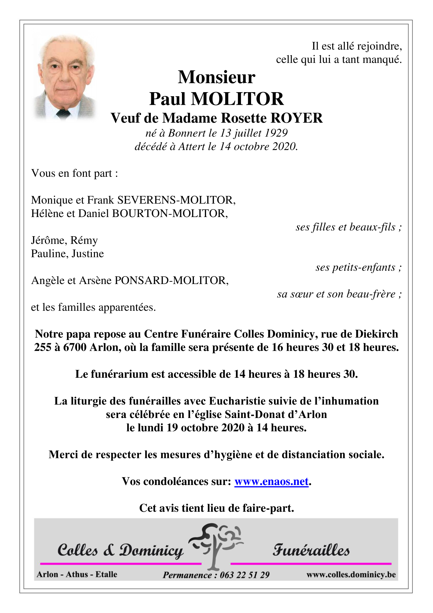 Décédé à Attert (6717) le mercredi 14 octobre 2020 à l'âge de 91 ans