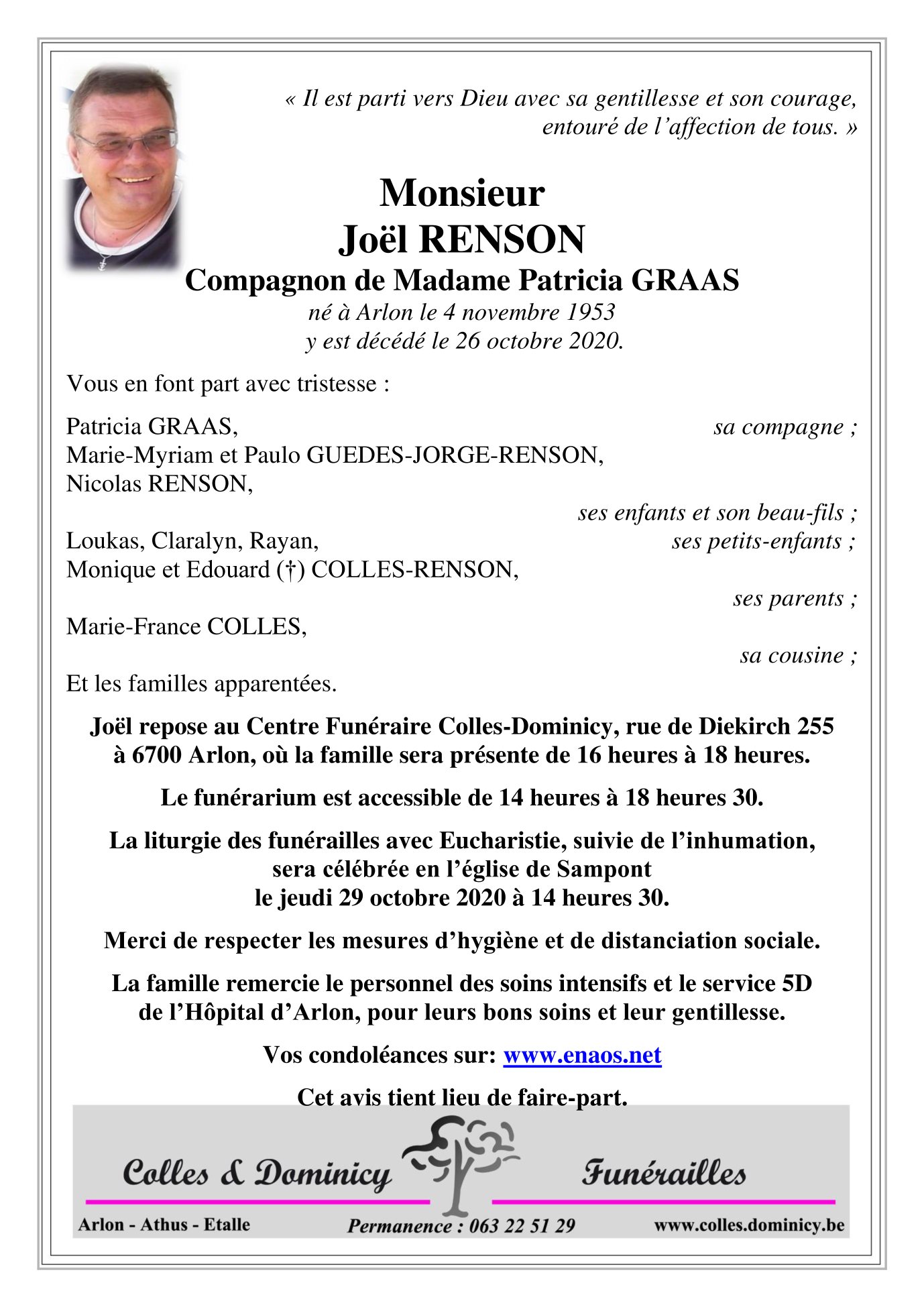 Décédé à Arlon (6700) le lundi 26 octobre 2020 à l'âge de 66 ans