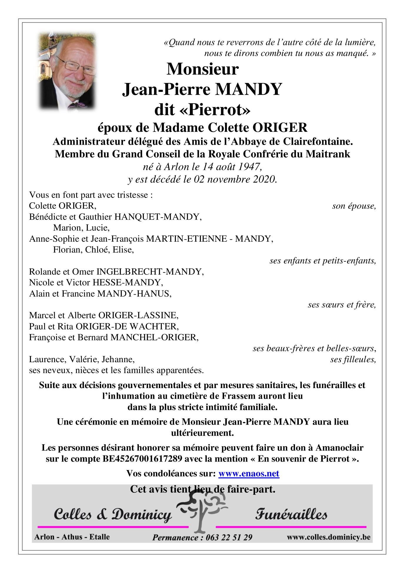 Décédé à Bonnert (6700) le lundi 2 novembre 2020 à l'âge de 73 ans